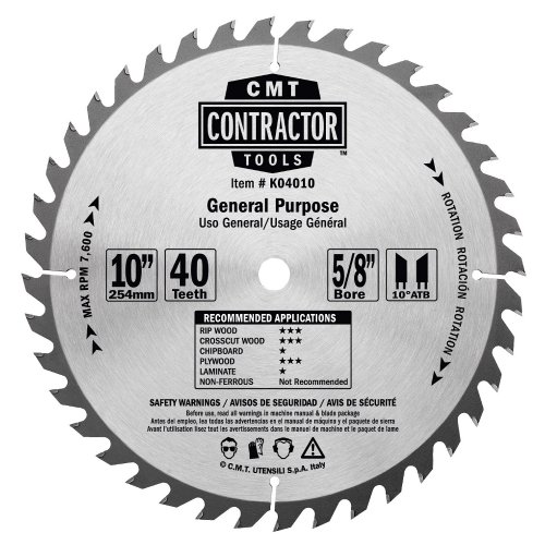 Description CMT K04010 ITK Contractor General Purpose Saw Blade, 10 x 40 Teeth, 10-Degree ATB with 5/8-Inch Bore